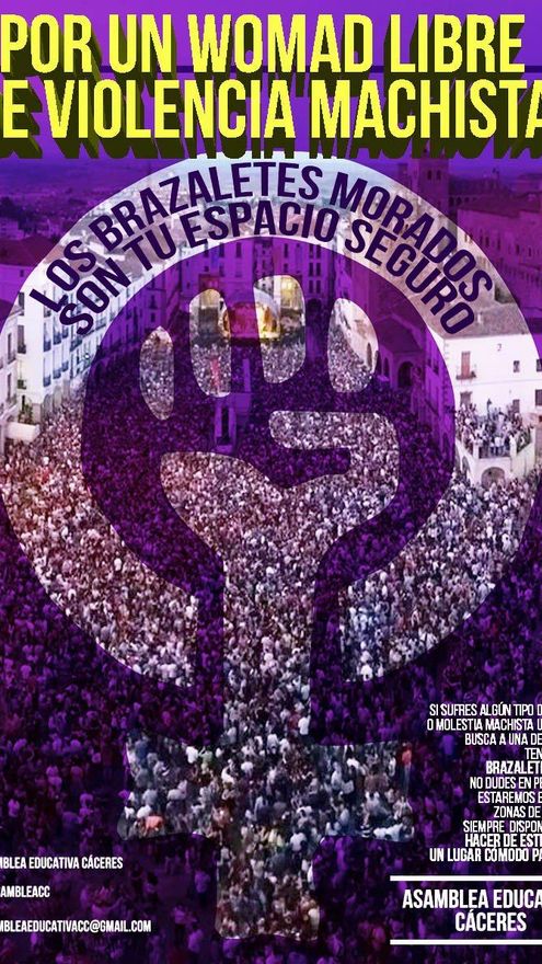 El área de feminismos de la Asamblea Educativa de Cáceres ha iniciado una campaña de brazaletes morados dentro del Festival WOMAD, que se celebra del 11 al 14 de mayo en la capital cacereña. Las personas participantes estarán repartidas a lo largo de toda la plaza durante este multitudinario evento, “siempre disponibles para hacer de este festival un lugar cómodo para todas”.