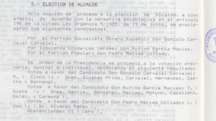 Pero no del todo. Mientras Carvajal no conseguía con sus cinco votos la reelección, García fue designado alcalde por siete (los suyos más dos del PP, entre ellos los de la probable alcaldesa a partir del sábado Magdalena Carmona). Lo más insólito de aquella sesión, según recoge el acta, es que el cabeza de lista del PP, Pedro Macías Collado, no se votó a sí mismo sino que lo hizo a IU, mientras que un compañero, Salvador Pérez, sí le votó y fue su único apoyo.