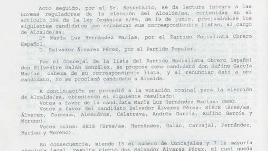Algo que se repitió cuatro años después, en 1999, aunque no forma tan estrambótica: siete votos para el candidato de IU (cinco suyos más dos del PP) y seis para la de PSOE, Mariluz Hernández.