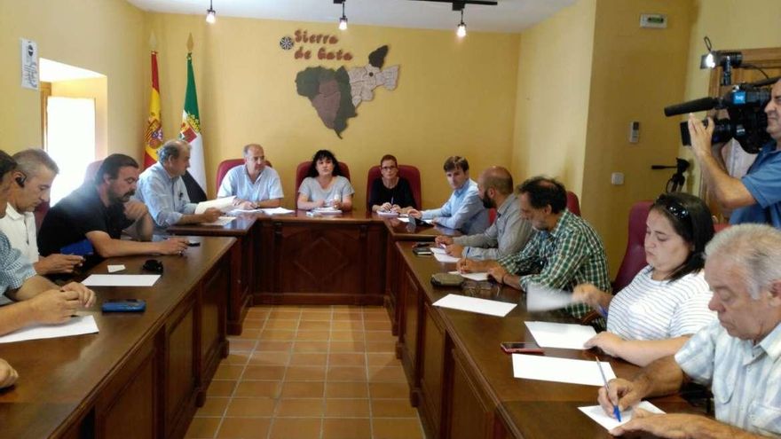 En la sede de la Mancomunidad de Municipios Sierra de Gata, en Hoyos, tuvo lugar una reunión de responsables de la misma, y alcaldes, con la secretaria general de Política Territorial y Administración Local, Nieves Esteban Paz, y el director general de Medio Ambiente Pedro Muños, ambos de la Consejería de Medio Ambiente y Rural, para escuchar las escuchar las propuestas e inquietudes de los alcaldes de los municipios afectados.