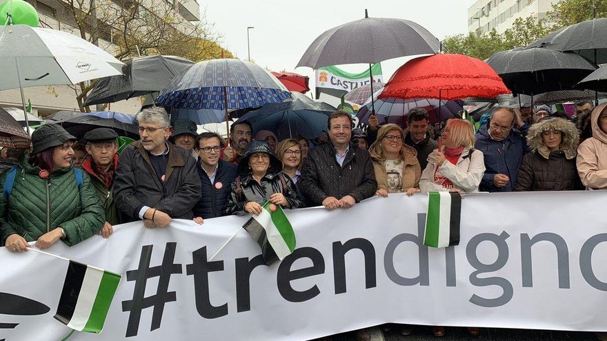 La convocatoria, totalmente unitaria el año pasado en la plaza de España de Madrid un 17 de noviembre, se había resquebrajado parcialmente ante la actitud del PP de convocar por su cuenta otra este sábado en la capital española -300 personas según la Delegación del Gobierno en Madrid- ya que los populares creían que se debía reclamar igual que el año pasado en la capital y en esta ocasión ante el Ejecutivo de Pedro Sánchez, y también Podemos se había desmarcado acusando a PSOE y PP de ser los responsables del atraso crónico del sistema ferroviario extremeño.
