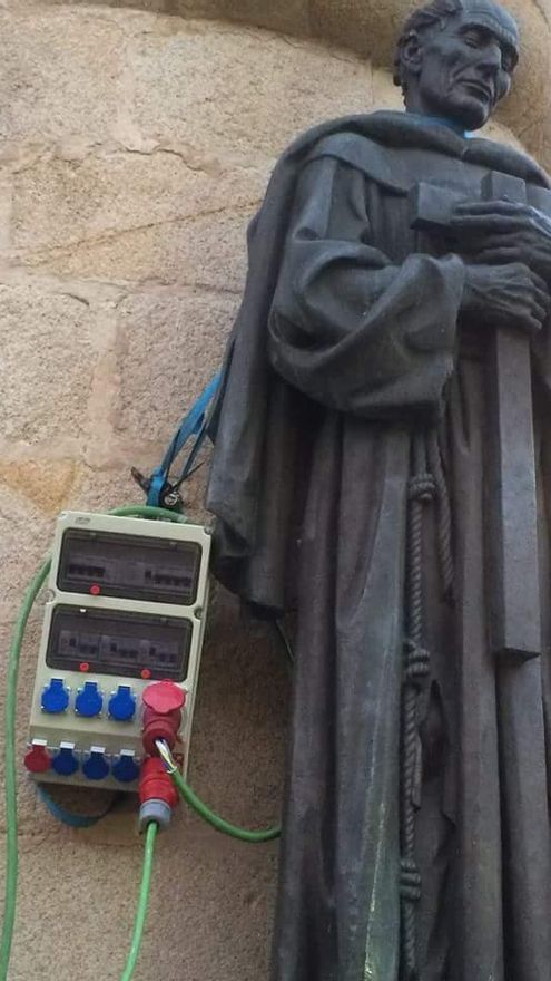 La polémica del montaje de la XV edición del mercado no termina en el sector hostelero y comercial. Durante algunas horas del pasado jueves, la estatua de San Pedro de Alcántara ubicada en la esquina de la Concatedral de Santa María, lució como soporte de cables haciendo las veces de torreta eléctrica. Un cuadro eléctrico colgaba a través de una correa que sujetaba el cuello de la representación del santo, una imagen que escandalizó a todos los turistas y devotos y que incendió las redes sociales durante la tarde y noche del jueves.