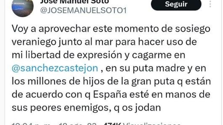 El artista escribió en Twitter el pasado 18 de agosto este mensaje: “Voy a aprovechar este momento de sosiego veraniego junto al mar para hacer uso de mi libertad de expresión y cagarme en Pedro Sánchez, en su puta madre y en los millones de hijos de la gran puta que están de acuerdo con que España esté en manos de sus peores enemigos. Qué os jodan”.