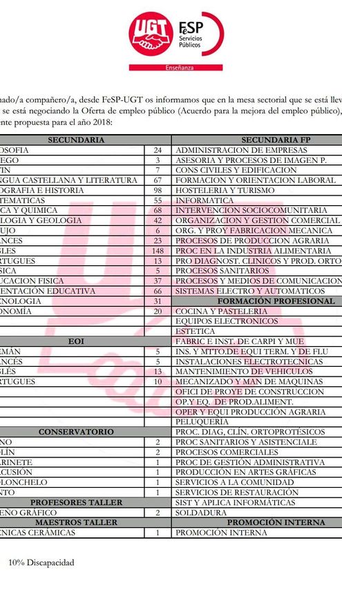 En FP, las especialidades con más plazas son Procesos de Gestión Administrativa, 45; Servicios a la Comunidad, 34; y Sistemas y Aplicaciones Informáticas, 33. En Escuelas Oficiales de Idiomas, se ofertan 13 plazas para Inglés; 10 para Portugués; 5, para Francés; y otras 5 para Alemán, mientras que en Conservatorio ofertan una plaza en Canto, Clarinete, Percusión y Violoncello; dos plazas para piano y otras dos para violín. Las dos plazas que salen en profesor de taller es para la especialidad de Diseño Gráfico.