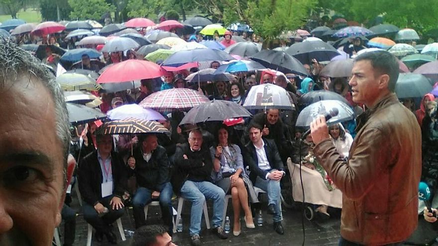 El dirigente madrileño ha rechazado un paraguas que le ofrecieron -“he decidido que si nos mojamos, nos mojamos todos y yo me mojo con vosotros”-, y en su intervención comenzó citando al expresidente del PSOE Ramón Rubial para afirmar que el partido no lo hacen sus dirigentes sino los militantes, y apostar a continuación por el voto democrático –“no es un problema sino una solución”- y la igualdad de mujeres y hombres.