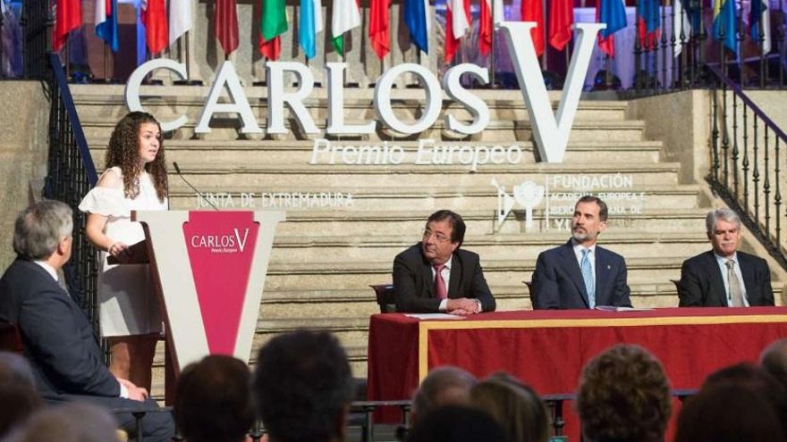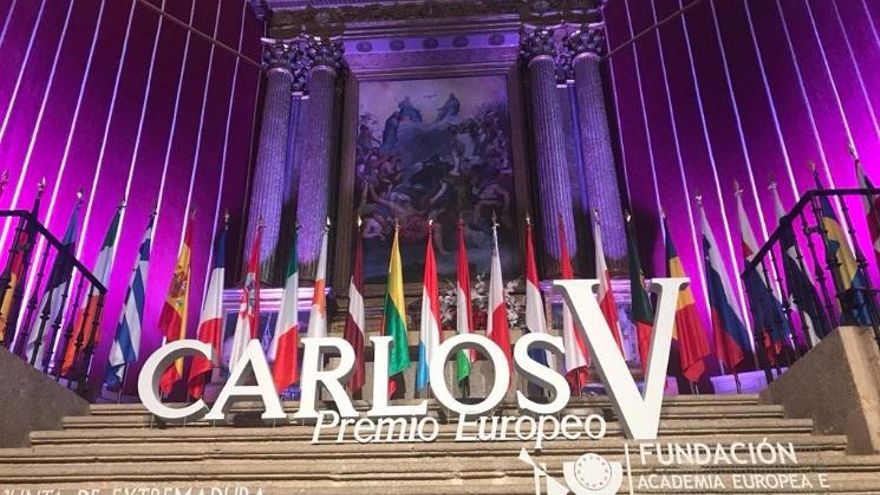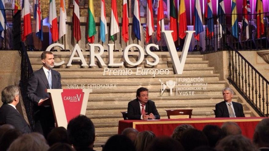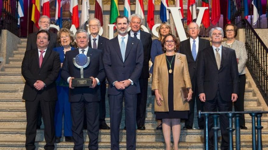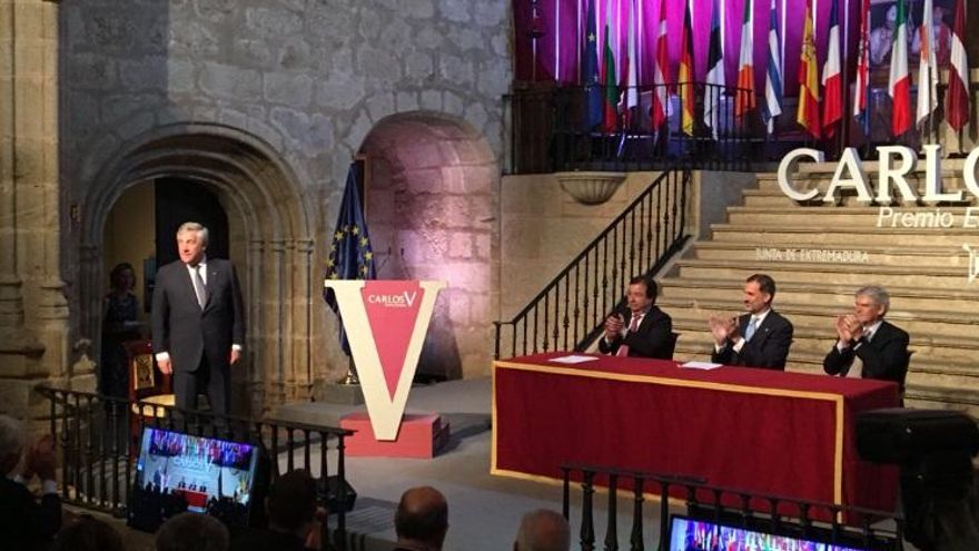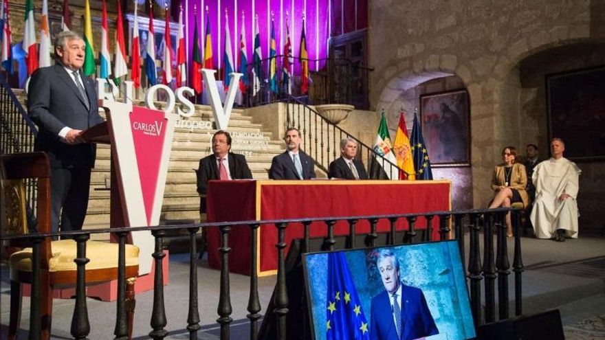 Felipe VI hizo entrega del XII Premio Carlos V al presidente del Parlamento Europeo, el italiano Antonio Tajani, en un acto solemne en el Monasterio de Yuste en el que también se ha impuesto a la secretaria general iberoamericana, la costarricense Rebeca Grynspan, la medalla que la acredita como nuevo miembro de la Academia Europea e Iberoamericana de Yuste.