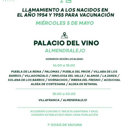 En el Palacio del Vino de Almendralejo, de cuatro a seis de la tarde, se vacunará a los residentes en Puebla de la Reina, Palomas, Puebla del Prior, Villalba de los Barros, Villagonzalo, Hinojosa del Valle, Alange, La Zarza, Solana de los Barros, Hornachos, Ribera del Fresno, Aceuchal, Aldea de Cortegana y Aldea de Retamal.