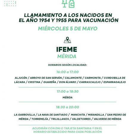 Así, de 16 a 17 horas están llamados para acudir a las instalaciones del Instituto Ferial de Mérida (Ifeme) los residentes de esas edades de Aljucén, Arroyo de San Serván, Calamonte, Carmonita, Cordobilla de Lácara, Cristina, Guareña, Don Álvaro, Carrascalejo, y Esparragalejo.