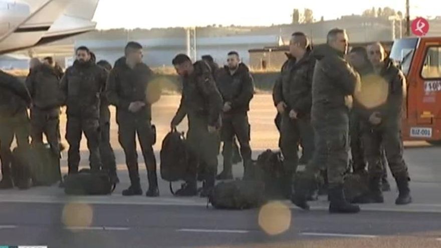 Han sido recibidos por familiares y amigos en un ambiente con emociones a flor de pie, acompañados de pancartas, banderas españolas y extremeñas y globos, y en el que se ha vivido incluso una petición de boda por parte de uno de los soldados a su pareja, que le estaba esperando y que, según ha confesado, le ha dado el sí.