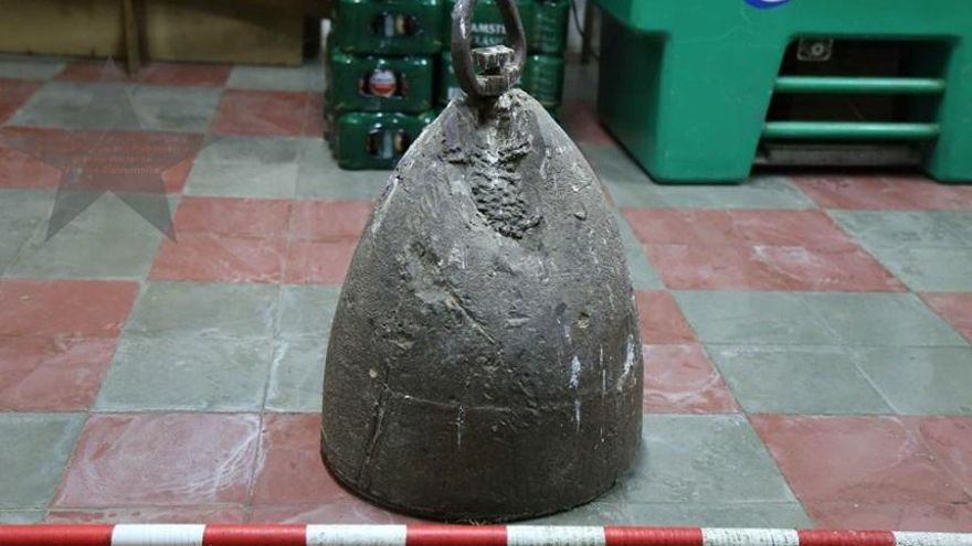 Se trata de un artefacto de guerra que no estalló, y que sustituyó a la campana de bronce confiscada por la República para ser fundida y convertida en fusiles.
