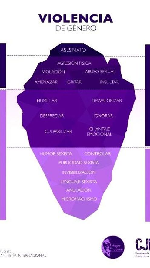 En materia de machismos es muy ilustrativo el esquema del iceberg, donde solo parece visible la agresión (la punta del problema). Pero debajo de este iceberg se esconden infinidad de formas de agresiones, que quedan invisible.