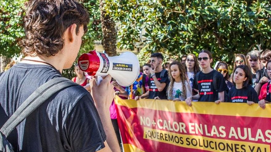 Uno de los estudiantes de Secundaria concentrados ha criticado que los despachos de los centros estén climatizados, mientras que en las aulas se soportan temperaturas “insoportables” que les hacen estar “todo el día sudando”.