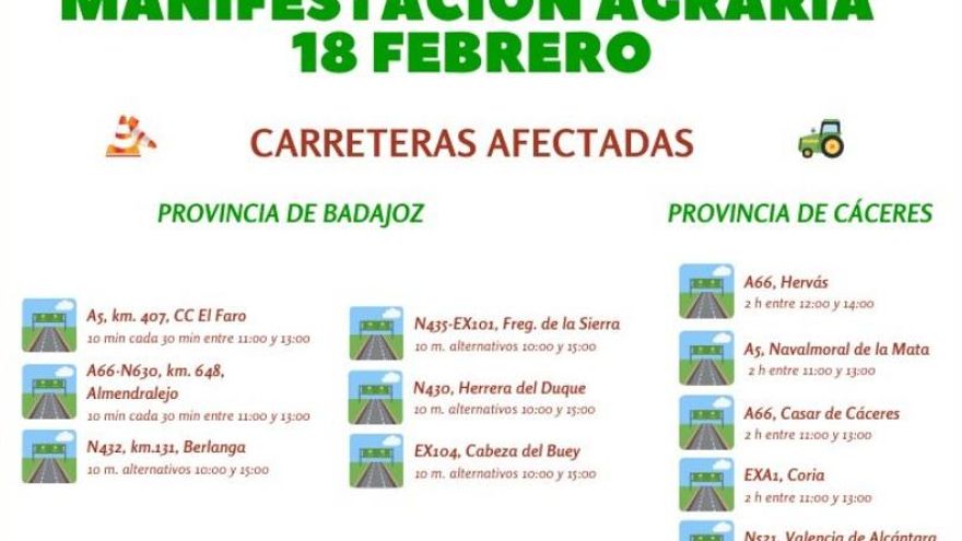Entre las vías que se verán afectadas se encuentran las autovías de Madrid (A-5), Sevilla y Salamanca (A-66). Los cortes afectarán a las conexiones de la Comunidad autónoma con Ciudad Real, Córdoba, Sevilla, Huelva, Salamanca, Madrid y Portugal.