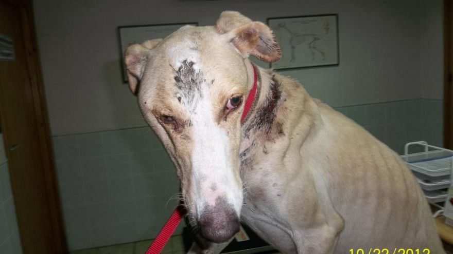 La historia de ‘Suerte’ es realmente dura. Esta galga fue encontrada en Don Benito (Badajoz) completamente desorientada, con fracturas en el cráneo causadas por varios mazazos, y con signos de ahorcamiento.