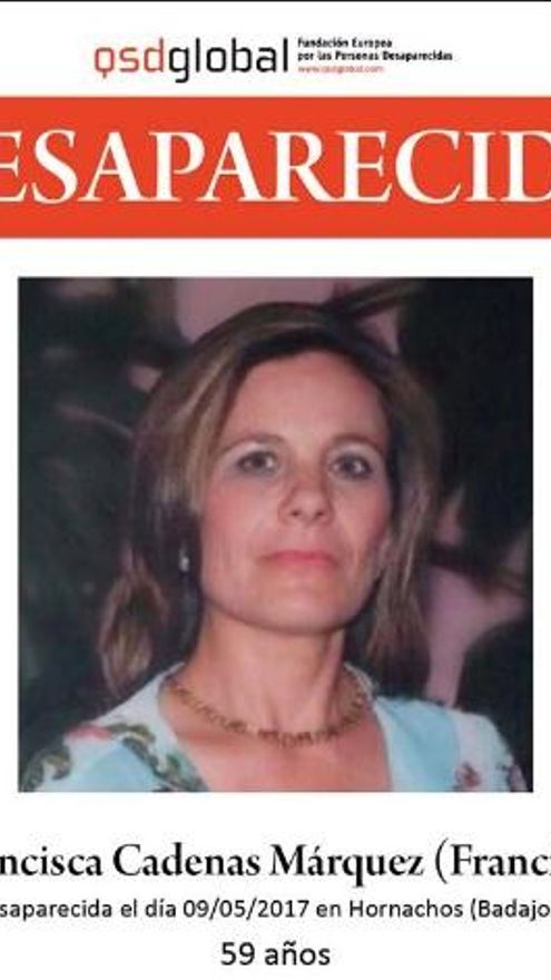 Francisca Cadenas, de 59 años, se encuentra en paradero desconocido desde la noche del martes 9 de mayo cuando salió de su casa un momento para despedir a una familia amiga y su hija, a la que había estado cuidando durante la tarde. Tras despedirse, retomó el camino de vuelta a su casa, situada en una calle cortada, pero nunca llegó a ella.