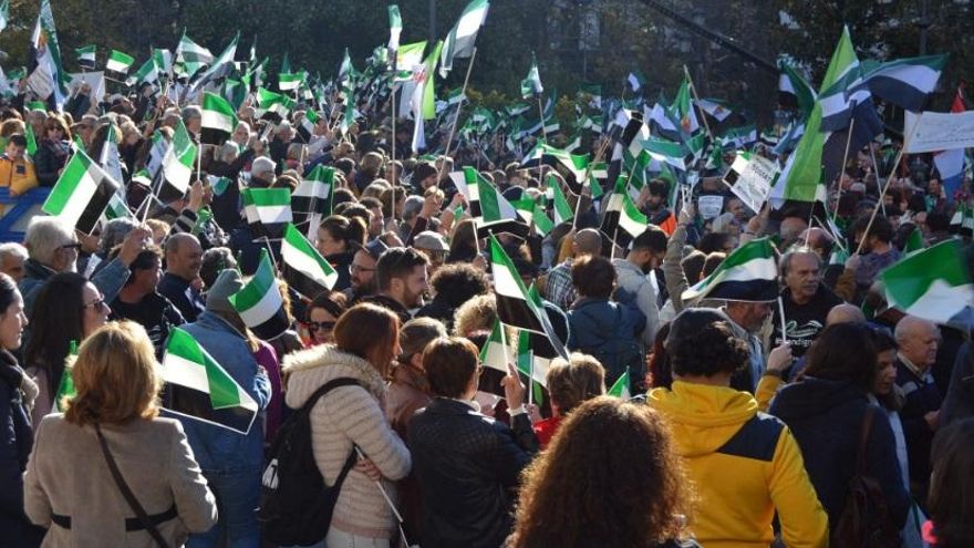 No menos de 20.000 extremeños se concentran para reclamar un tren digno para la región. La bandera verde, blanca y negra toma este sábado las calles de la capital española para poner de manifiesto que en el siglo XXI Extremadura tiene una red de vía única, sin electrificar y con trenes de media distancia.