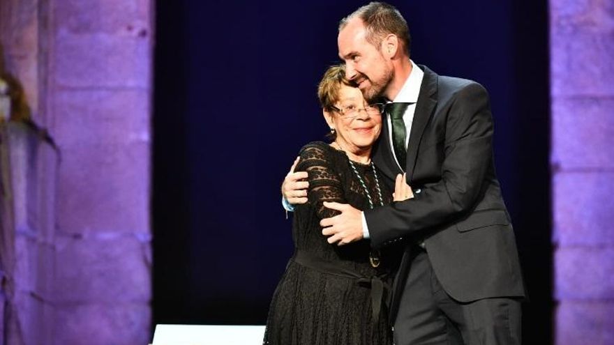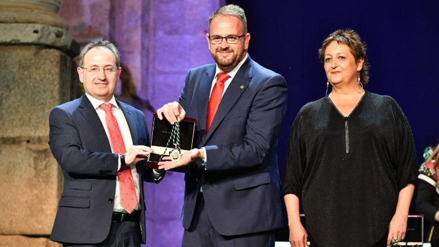 La actriz emeritense Ana Trinidad ha sido la encargada de entregar el galardón al Consorcio Patronato del Festival Internacional de Teatro Clásico de Mérida. A la tribuna han subido el alcalde de Mérida, Antonio Rodríguez Osuna, en nombre del patronato de este certamen teatral público, acompañado del actual gestor y dueño de Pentación Espectáculos, el empresario Jesús Cimarro.