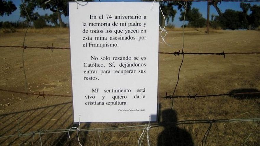 Conchita Viera tiene muy presente la memoria de su padre, alcalde republicano de Valencia de Alcántara asesinado por el franquismo junto a otras 11 personas. La memoria de estas personas sigue silenciada detrás de la verja que impide acceder a la finca de esa misma localidad en la que están los restos. Dentro de una antigua mina se encuentra la fosa común en la que yacen los cuerpos.