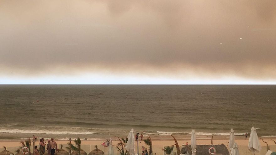 Desde la playa de Matalascañas se veía este domingo una gran humareda, y por el viento las cenizas llegaron a la localidad.