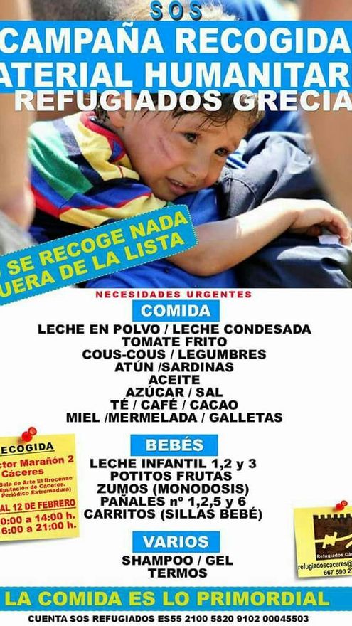Así el colectivo destaca la gran solidaridad de los cacereños ante una situación de “extrema gravedad”. Recuerda que las graves condiciones en las que sobreviven los refugiados en Grecia llevó a la plataforma a emprender una campaña de recogida de alimentos de primera necesidad, que está resultando un éxito.