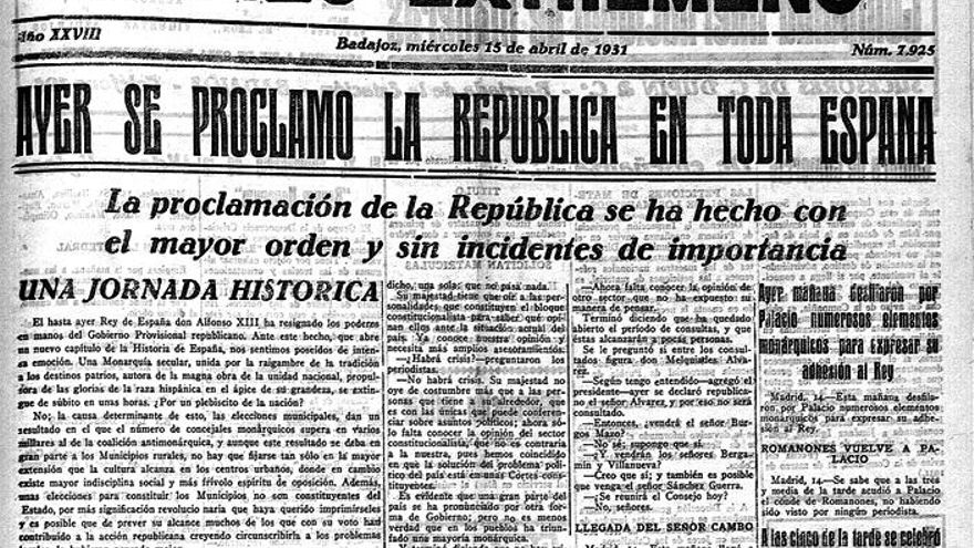 ‘El Correo extremeño’ relataba en su edición del 15 de abril de 1931 cómo la república se había instaurado en la capital pacense el día antes sin incidentes. Cuenta que el 14 de abril, a las cinco de la tarde, decenas de personas se agolpaban en la Plaza de la Constitución, mientras que horas más tarde una “imponente” manifestación recorrió las calles del centro.