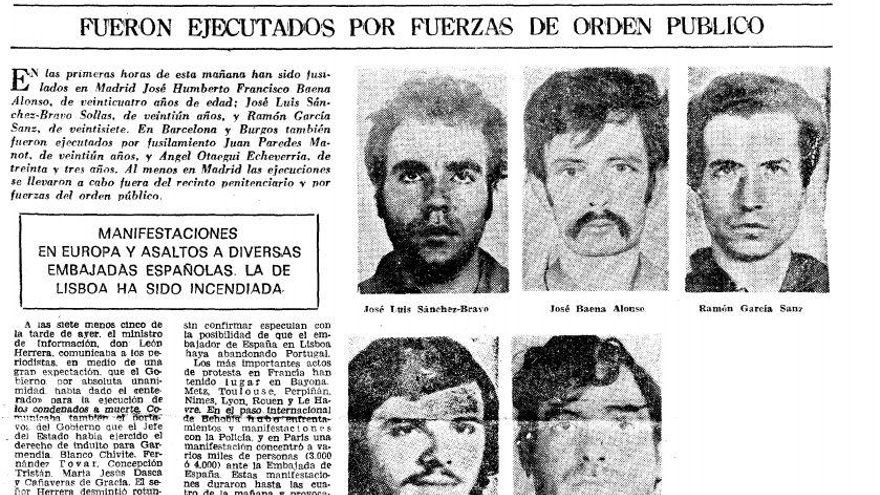 El 27 de septiembre de 1975, José Luis Sanchez-Bravo, Xosé Humberto Baena, Ramón García, Ángel Otaegui y Juan Paredes Manot “Txiki”, fueron asesinados por el gobierno de Franco. Se trataba de cinco jóvenes militantes, los tres primeros formaban parte del Frente Revolucionario Antifascista y Patriota (FRAP) y los dos últimos de ETA.