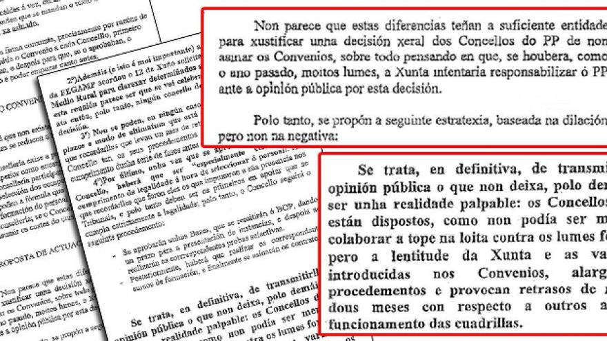 La conducta recomendada desde la cúpula del PP quedaba resumida de este modo: “No se puede, en ningún caso, admitir las prisas y los plazos a modo de ultimátum que está dando la Consellería. Así, lo procedente era dirigirse al Ejecutivo no para firmar, sino para ”recordar“ que Medio Rural ”lleva un mes de retraso en los trámites“ y que ”un Ayuntamiento tiene sus procedimientos“ para, por ejemplo, ”seleccionar al personal“, elección en la que en esa ocasión era procedente ser ”especialmente celosos“. ”Se trata, en definitiva -sintetizaba- de transmitirle a la opinión pública que los ayuntamientos del PP están dispuestos (...) a colaborar a tope en la lucha contra los fuegos forestales“, si bien ”la lentitud de la Xunta y las variaciones introducidas en los convenios alargan los procedimientos y provocan retrasos de más de dos meses“. Debía quedar claro, además, que ningún regidor popular accedería a firmar los convenios en un acto público único y conjunto con el conselleiro, al considerarlo ”propagandístico“.