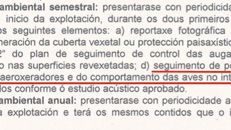 Entre los condicionantes establecidos por la Xunta para autorizar el parque estaba el “seguimiento de posibles colisiones de la avifauna con los aerogeneradores y del comportamiento de las aves en el interior del parque”, que debía realizarse de manera semestral durante los dos primeros años y anualmente desde entonces. “En caso de que se comprobase un impacto grave, tanto sobre las poblaciones migratorias o residentes [la Xunta] podrá requerir del promotor las medidas oportunas para corregir la situación, pudiendo incluir la reubicación y/o eliminación de los aerogeneradores que produjesen tal afección”, añadía la Xunta.