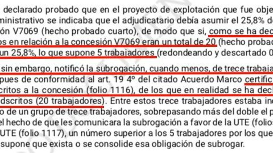 Tras llevar varios trabajadores sus casos a los juzgados, en los últimos meses el TSXG emitió varias sentencias obligando a Arriva a asumir a parte de ese personal que según los datos que había facilitado a la Xunta debían pasar a manos de la nueva UTE. En una sentencia del pasado febrero el TSXG ratificó que según las condiciones del nuevo concurso debían ser subrogados por la nueva empresa adjudicataria el 25% de los trabajadores que prestaban servicio para Arriva en la anterior concesión, que fue dividida en varias más pequeñas. Arriva comunicó que la anterior concesión contaba con 50 trabajadores, por lo que la nueva adjudicataria debía asumir a 13. Sin embargo, el TSXG considera probado que realmente el total de empleados eran 20 y que por lo tanto solo debían ser subrogados 5. Arriva, dice el TSXG, “certificó un número mayor de trabajadores adscritos a la concesión de los que en realidad se ha declarado probado que estaban realmente adscritos”.