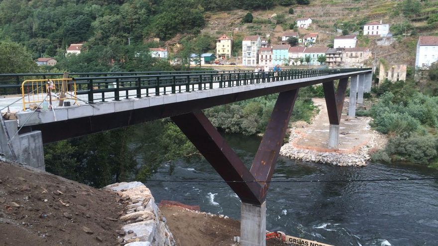 Un nuevo puente para Os Peares, con menos impacto, fue lo que prometió Feijóo el 14 de mayo de 2010, un año y un mes después de tomar posesión como presidente de la Xunta. El viaducto, junto a la que había sido su casa, se finalizaría en 2012 tras una inversión de 1,7 millones de euros. Este viernes, cuatro años después de lo prometido y con un coste elevado a cerca de 2,8 millones, los trabajadores estaban aún realizando las pruebas de carga del puente, que los vecinos ya cruzan saltando el vallado de obras a pesar de que aun no está rematado del todo. Lo hacen porque evitan así tener que pasar por los municipios lucenses de Carballedo y Pantón en un rodeo de más de cinco kilómetros para los vehículos o de un kilómetro para los peatones, obligados a emplear una estrecha pasarela de la línea ferroviaria que también atraviesa el pueblo. Este viernes Feijóo no se ha referido al puente en su discurso ante sus vecinos. No hace falta. Todos saben en Os Peares que el puente lo ha hecho “el nieto de Eladia, el hijo de Sira y Saturnino”