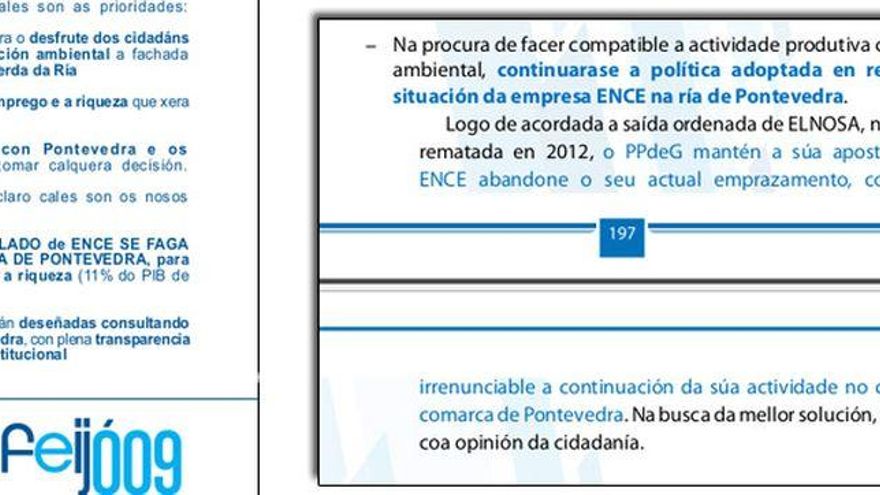 No fueron pocas las promesas de los populares gallegos sobre el traslado de la pastera. Así, en la página 76 del programa económico con el que Feijóo ganó los comicios de 2009 el PPdeG aseguraba tener “claro” que iba “a recuperar para el disfrute de los ciudadanos” la “fachada marítima del margen izquierdo de la ría de Pontevedra”. Esto incluía su regeneración ambiental y “garantizar que el traslado de ENCE se haga dentro de la comarca de Pontevedra”, siempre “consultando con los ciudadanos” y con “plena transparencia”.