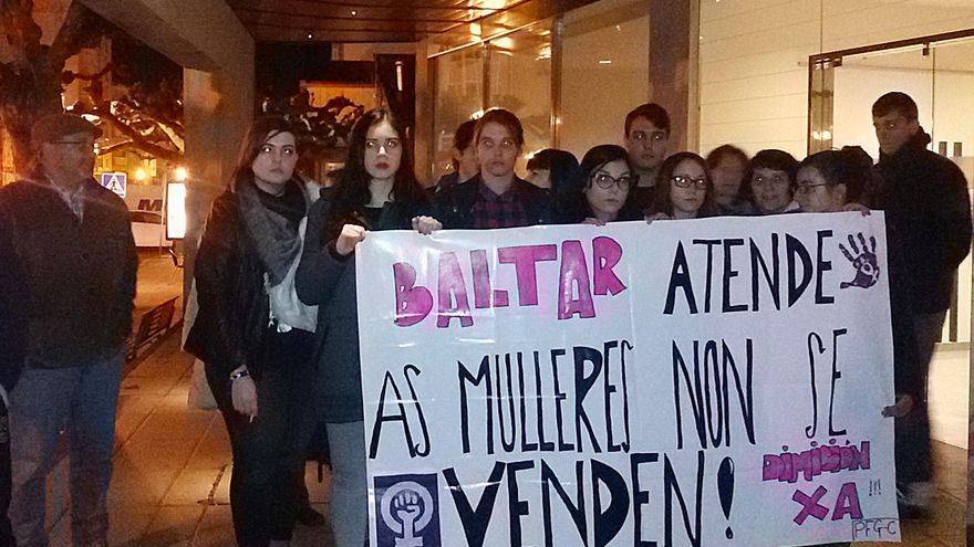 “Baltar, atiende, las mujeres no se venden. Dimisión ya”. Era la pancarta que portaban una veintena de personas, la mayoría mujeres, en la entrada al primer mitin que han compartido el presidente de la Diputación y del PP de Ourense, José Manuel Baltar, y el de la Xunta y del PP gallego, Alberto Núñez Feijóo, después de que el primero fuera denunciado por supuestamente ofrecer empleo a cambio de sexo, como reveló en exclusiva eldiario.es.