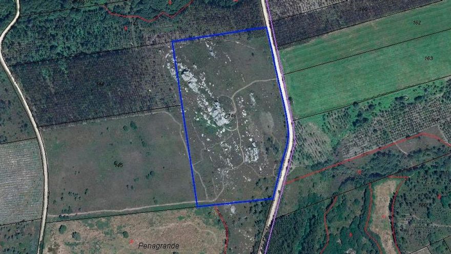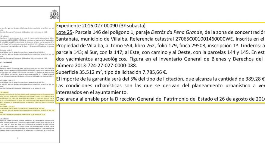 El yacimiento de Pena Grande está incluido ahora en una finca de algo más de 35.000 metros cuadrados, resultado de la unificación de varios terrenos sin propiedad conocida procedentes de la concentración parcelaria en el entorno. El 26 de agosto de 2016 la Dirección General de Patrimonio del Estado la declaró “alienable”, esto es, susceptible de ser vendida al considerar que “no resulta necesaria para el uso general ni para el servicio público” y tampoco “resulta conveniente su explotación”. Fue por eso que la incluyó en el paquete de 30 fincas que se dispone a subastar el día 15 de diciembre a las 11 de la mañana en el salón de actos de la Delegación de Economía y Hacienda de Lugo.