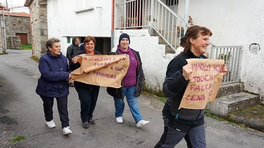 Convocados a las 19 horas en la parada del bus, lugar de reunión y punto de encuentro de la aldea. E hicieron un montón de pancartas con referencias a situaciones cotidianas de desigualdad. “La creación de estas pancartas ya dio pie a situaciones en las que las mujeres dejaban de hacer las tareas cotidianas de cuidados o de la casa para invertir un poquito de tiempo en sí mismas”, cuenta Carla. “Manolo, hoxe fas a cena solo” (Manolo, hoy haces la cena solo) o “En Loureiro e en Pombeiro, a cena que a faga o panadeiro” (En Loureiro y en Pombeiro, la cena que la haga el panadero) fueron algunos de los lemas, con referencias a personas del lugar que son fácilmente identificables en cualquier otro, del rural o de la urbe.
