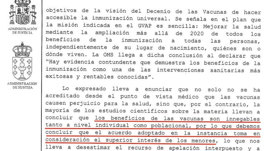El auto añade que “evidentemente no puede quedar al arbitrio de un de los progenitores decidir si desea vacunar a los hijos y en qué momento” e incide en que la facultad de decisión otorgada al padre y ahora ratificada “está condicionada a que la misma se realice conforme al programa y calendario gallego de vacunación infantil” establecido por el Servicio Gallego de Salud (Sergas).
