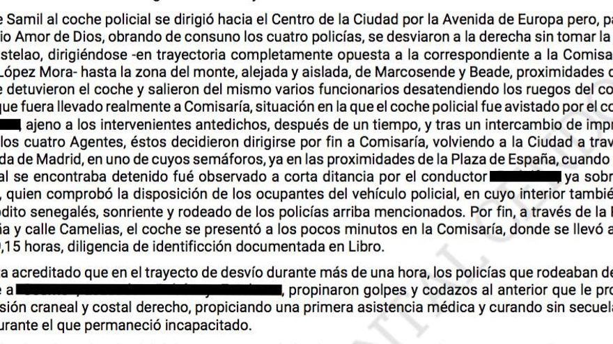 Al poco de iniciar el viaje, del que dieron cuenta varios testigos, “se desviaron” en “trayectoria completamente opuesta a la comisaría” hasta una “zona de monte, alejada y aislada, de Marcosende y Beade, proximidades del CUVI [campus universitario de Vigo], donde detuvieron el coche y salieron del mismo varios funcionarios desatendiendo los ruegos del conducido para que fuera llevado realmente a comisaría”, a la que no llegaría hasta las 19,15 horas. La sentencia dice que “consta acreditado que en el trayecto de desvío durante más de una hora, los policías que rodeaban dentro del coche a Mamadou Kane [...] propinaron golpes y codazos al anterior que le produjeron contusión craneal y costal derecho, propiciando una primera asistencia médica y curando sin secuelas en un día, durante el que permaneció incapacitado”.