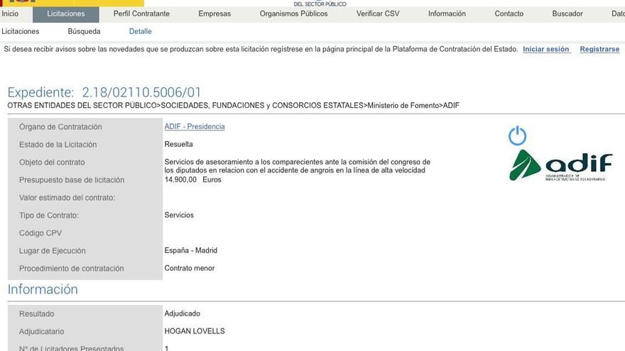 Según refleja Adif tanto en su web como en la plataforma de contratación del Estado, el pasado 19 de julio la empresa pública dependiente de Fomento adjudicó un contrato menor -que por su cuantía puede entregar 'a dedo' a la firma que desee sin convocar un concurso público- a Hogan Lovells con el objeto “servicios de asesoramiento a los comparecientes ante la comisión del Congreso de los Diputados en relación con el accidente de Angrois en la línea de alta velocidad”. No hubo ofertas de más empresas y le fue adjudicado el contrato por un período de tres meses y un importe de 14.900 euros sin impuestos (18.029 euros con ellos).