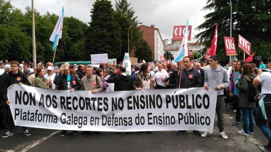 El cierre del CPI Monte Caxado de As Pontes y del CEIP Emilio Navasqüés de Outes -con el traslado de su alumnado a centros próximos-, la supresión de la ESO en los CPI Tomás de Lemos (Ribadavia) y Ribeira (O Porriño) y la supresión de plazas docentes en el IES de Celanova o el CEIP de Calo (Teo) han dejado este jueves de ser conflictos aislados para unirse en una única movilización frente a la sede central de la Xunta en Santiago. Familias enteras, docentes, sindicatos de la educación y los líderes de las tres fuerzas de la oposición parlamentaria se han puesto tras las pancartas, muchas de ellas de factura artesanal, y han unido sus voces en gritos contra los recortes acompañados por instrumentos procedentes de aulas de música.