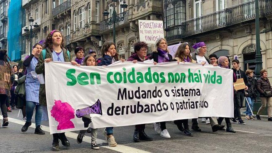 Un 8 de marzo más, las calles de Galicia se llenan de reivindicación feminista. Miles de personas se sumaron a lo largo del día de hoy a las diferentes convocatorias de Galegas8M para gritar en la calle que las mujeres cargan con la mayoría de los trabajos de cuidados. Con el lema “Sen coidados non hai vida. Mudando o sistema, derrubando o patriarcado” al frente de las manifestaciones, las marchas corearon consignas para visibilizar el trabajo oculto y no remunerado que realizan en su mayoría las mujeres.
