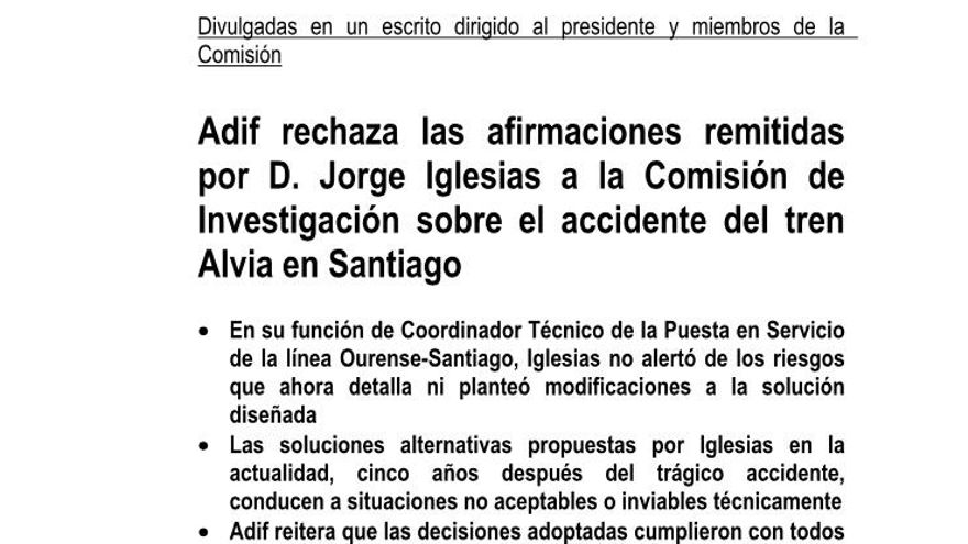 Tras la carta de Iglesias al Congreso criticando a Adif, y antes de su comparecencia de este miércoles, la empresa pública emitió una insólita nota de prensa (no suele pronunciarse sobre el accidente) cargando contra él y acusándolo de no alertar de esos supuestos riesgos de la curva de Angrois a pesar de trabajar en su construcción. Iglesias respondió este miércoles que en aquel momento él no tenía entre sus responsabilidades supervisar los sistemas de seguridad del AVE Ourense-Santiago en el que ocurrió el accidente sino sólo coordinar las diversas obras que se estaban haciendo. Pero esa nota de prensa de Adif contra su visión crítica ha sido el hilo del que este miércoles han tirado varios grupos parlamentarios para cargar contra la versión oficial de que la culpa había sido sólo del maquinista en la que incidieron Fomento y Adif tras el siniestro.