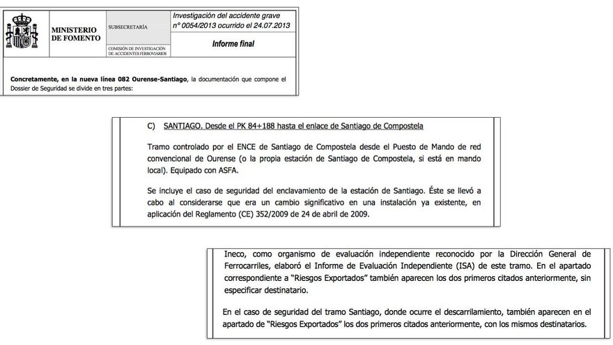 Unos párrafos antes de ese punto, la propia CIAF dice que la seguridad de ese tramo final de Santiago se analizó “en aplicación del Reglamento (CE) 352/2009 de 24 de abril de 2009”. Sin embargo, ese reglamento es precisamente el que exige la realización de una evaluación independiente como la que Ineco sí había realizado en el tramo justo anterior. Además, la propia Adif mantiene ahora que no aplicó ese reglamento y no encargó una evaluación independiente a Ineco porque no era obligatorio. Las fuentes consultadas del caso discrepan si la CIAF dio por hecho que ese análisis había sido realizado sin comprobarlo o, por la manera en que lo obvió unos párrafos más adelante al referirse al tramo final de Santiago, ocultó que no se había hecho.