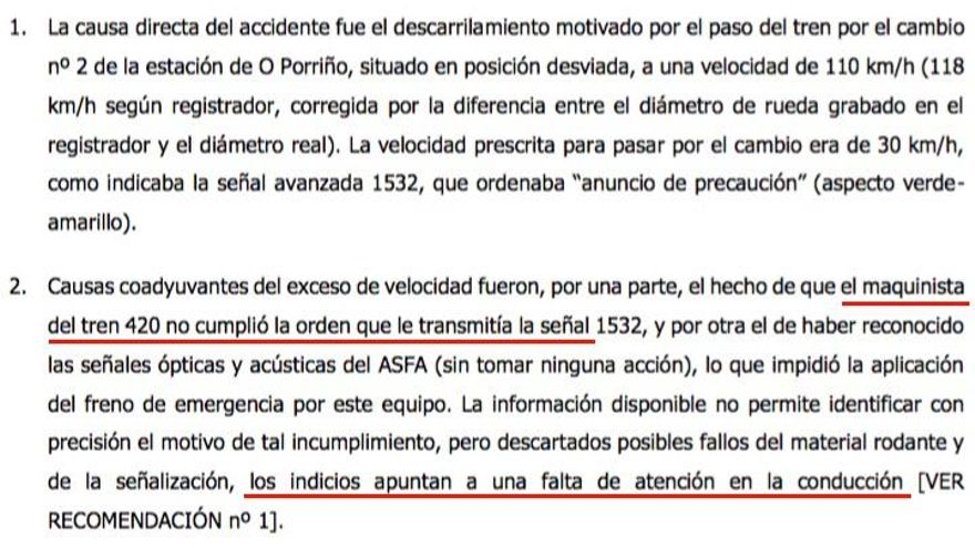 Todas esas consideraciones que el propio informe de la CIAF realiza sobre el tipo de sistema de control de la velocidad instalado en el tren siniestrado no se trasladan al apartado de conclusiones del informe, en el que se apunta a la no actuación del maquinista matizando que “la información disponible no permite identificar con precisión el motivo de tal incumplimiento, pero descartados posibles fallos del material rodante y de la señalización, los indicios apuntan a una falta de atención en la conducción”.
