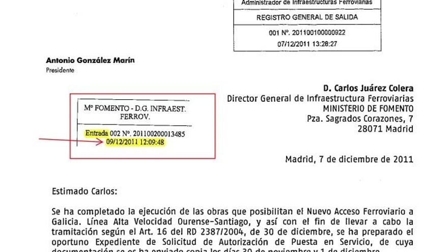Sobre el proceso de puesta en servicio de la línea en diciembre de 2011, la plataforma de víctimas consiguió los documentos de petición por parte de Adif y autorización por parte de Fomento con las horas de entrada y salida respectivas que revelan que la autorización fue emitida en poco más de una hora. Esos documentos fueron revelados este miércoles en el Congreso por la diputada de En Marea Alexandra Fernández, pero el cargo de Fomento insistió en que el trabajo de supervisión de si Adif había cumplido con la normativa ya se venía desarrollando desde varios días antes y esa autorización no fue más que el paso final formal.