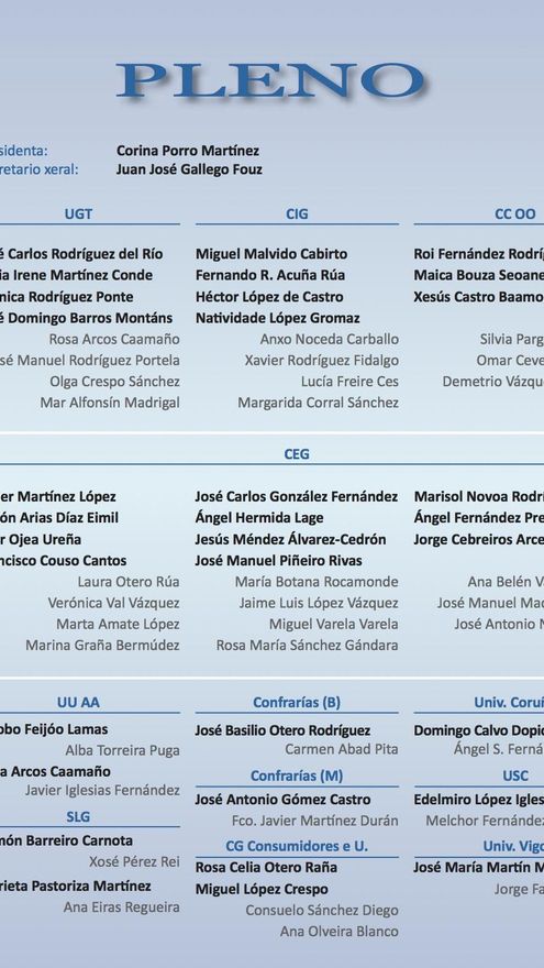 El Consello Económico e Social (CES) de Galicia es el “foro permanente de diálogo y deliberación entre los agentes económicos y sociales y la Xunta de Galicia”, según se define. Su presidenta, designada por la Xunta, es la exconselleira con Manuel Fraga y exalcaldesa de Vigo por el PP Corina Porro, pero a pesar de ser el principal órgano consultivo sobre la sociedad gallega, su pleno está compuesto mayoritariamente por hombres, 25, frente a sólo 8 mujeres. Uno reparto que no es responsabilidad del CES como tal sino de las organizaciones que forman parte de él que designan libremente a sus representantes, principalmente del empresariado, pero también de las universidades, sindicatos y cofradías de pescadores.