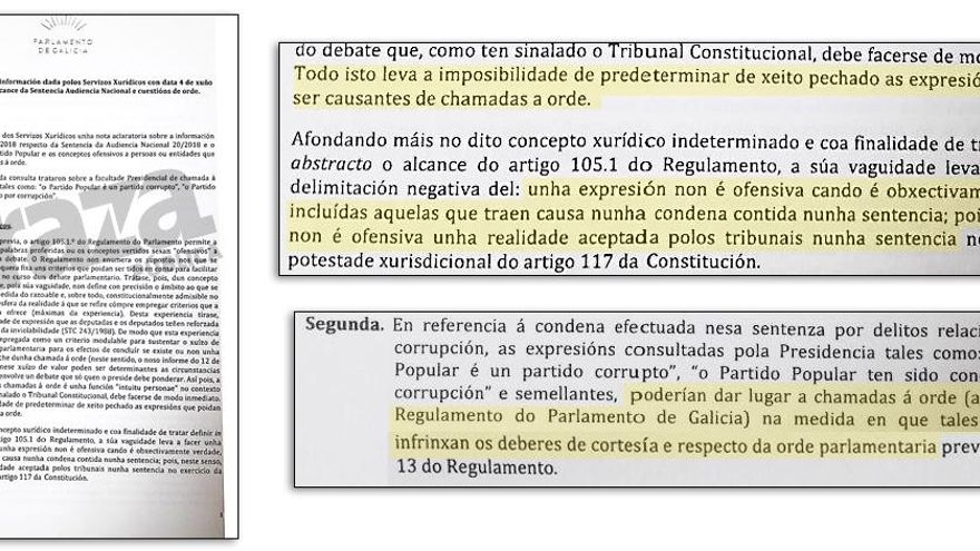 Según indican los letrados en ese documento, a cuyo contenido íntegro ha tenido acceso Praza.gal, fue el propio presidente quien pidió “una nota aclaratoria” sobre la sentencia del caso Gürtel “y el alcance de la condena al Partido Popular y los conceptos ofensivos a personas o entidades que pueden dar lugar a llamadas al orden”. En particular, indica, “los extremos de la consulta trataron sobre la facultad presidencial de la llamada al orden sobre expresiones tales como 'el Partido Popular es un partido corrupto' o 'el Partido Popular ha sido condenado por corrupción'. Santalices solicitó conocer, por lo tanto, si puede aplicar en este caso el artículo 105 del Reglamento parlamentario, que lo faculta para instar a la retirada de ”conceptos ofensivos al decoro de la Cámara“ y, si el diputado o diputada se niega, hacerlo por iniciativa propia con la correspondiente sanción.
