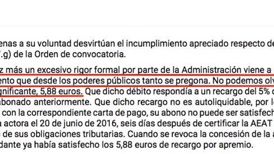 El tribunal explica que aunque las ayudas forman parte de un proceso de concurrencia competitiva, al que pueden acudir otros solicitantes, la Xunta pudo resolver la situación con la autónoma en cuestión sin quitarle directamente la ayuda a ella. E insiste: “Este tribunal no puede compartir el excesivo rigor formalista de que hace gala la Administración demandada a la hora de revocar la ayuda concedida. Nada impedía a la Administración instar, bajo otorgamiento de plazo para la subsanación de defectos, la acreditación del extremo controvertido [el pago de la deuda pendiente de 5,88 euros]; y eso en modo algún irrogaría perjuicios a otros aspirantes a la concesión de las ayudas”.