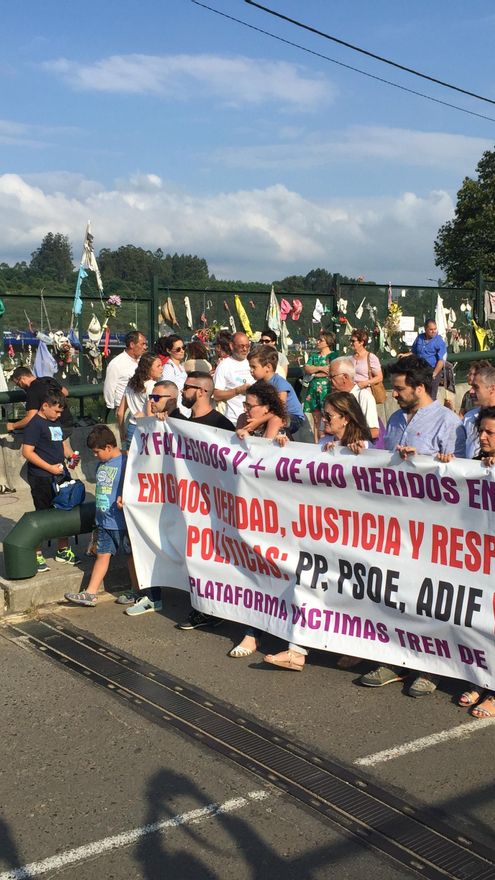 Como en años anteriores, una manifestación de víctimas y simpatizantes de su causa salió a las once de la mañana de la estación de tren de Santiago a la que nunca llegó aquel Alvia. Su paso por las calles del centro de Compostela fue recibido con momentos de silencio respetuoso y algún aplauso espontáneo de la ciudadanía y turistas que contemplaban la marcha. A su llegada a la plaza del Obradoiro, frente a la catedral de Santiago, los afectados leyeron un manifiesto en el que criticaron que “durante cinco años, la maquinaria del Estado trabajó para eximir la responsabilidad de quienes fueron negligentes” y destacaron que ahora “llegó la hora de que los responsables que ocupaban cargos decisivos den la cara y asuman su responsabilidad, ya que ninguno dimitió ni fue cesado”.