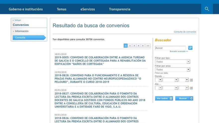 En su balance sobre la Ley de Transparencia la Xunta nada dice sobre otro de los ámbitos en los que la norma le obliga a tener una actitud activa en la divulgación de información, el de los convenios que firma con otras administraciones o empresas. La página web en la que el Gobierno gallego debe hacer públicos esos textos lleva más de medio año sin actualizarse.