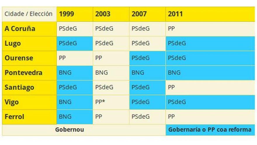 Algo semejante sucedería en 2011. En Vigo, Porro encadenaría su segundo mandato y en Pontevedra los de Feijóo lograrían de nuevo la Alcaldía a pesar de tener el mismo número de ediles que el BNG, algo idéntico a lo que pasaría en Ourense con el PSdeG. El Ayuntamiento de Lugo retornaría también a manos de los populares que, en vez de dirigir tres ciudades y ser oposición en cuatro, gobernarían en las siete. Según Feijóo, una operación con estos resultados sería positiva porque “por algo hay que empezar”, si bien él es partidario de que este sistema se extienda también al Parlamento de Galicia y a las Cortes Generales.