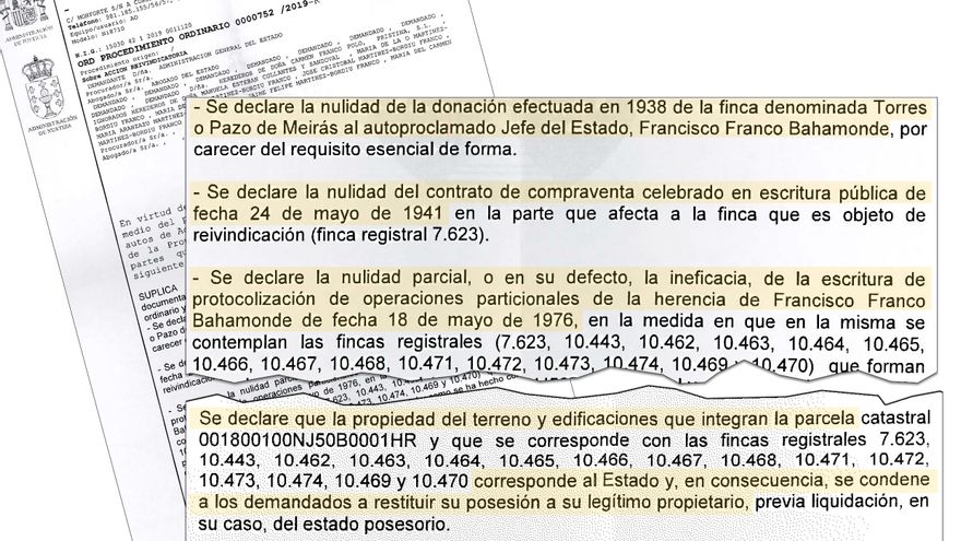 Al mismo tiempo, el Estado -y ahora también Sada y la Xunta- piden “la nulidad parcial o, en su defecto, la ineficacia” de las operaciones efectuadas en 1976 para repartir la herencia del militar golpista entre sus descendientes, toda vez que en ella se contemplan estas propiedades. La finalidad última del proceso, explicita, es que “se declare que la propiedad del terreno y edificaciones (...) corresponden al Estado” y que los herederos del dictador sean condenados a devolverlas.
